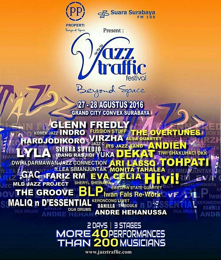 Jazz Traffic Festival tahun ini akan di isi juga oleh sejumlah musisi dan grup musik yang notabene bukan beraliran jazz di ajang PP Properti Jazz Traffic Festival (JTF) 2016 Beyond Space, yang dihelat di Grand City Surabaya, 27-28 Agustus 2016. Konsep JTF tahun ini adalah bazar musik, supaya bisa saling apresiasi dan sosialisasi dengan penikmat musik lain. Makanya kita undang musisi dari berbagai genre musik. Yang pasti JTF bisa jadi etalase bagi musisi jazz lokal Surabaya, yang nantinya kita harap bisa mengarah ke level nasional bahkan internasional. Jadwalnya sebagai berikut: